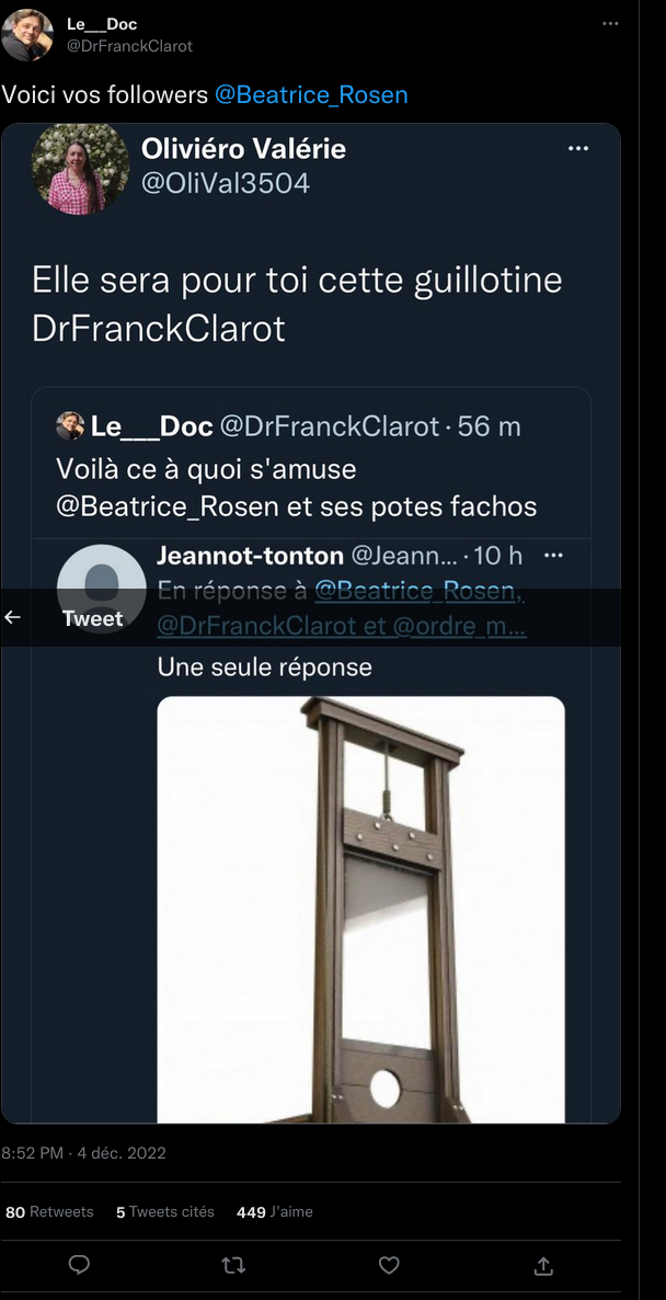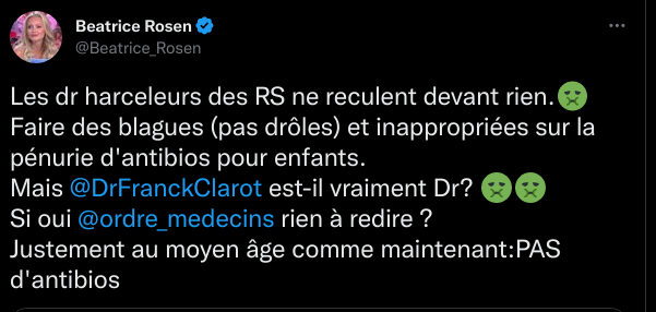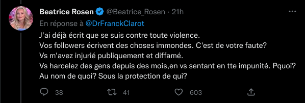 Le compte Twitter du médecin a subi des menaces de mort dont il a demandé à la chroniqueuse Beatrice Rosen influenceuse et actrice dont elle continue à nier ses propos tout en diffamant sans avoir les compétences pour comprendre la médecine (ndr. Je ne peux que mettre une portion du fil mais dans tout ce fil elle parle de médecine tout en publiant quelques fois des intox en sourçant mais elle fait comme le youtuber Sciencoder indique dans cette vidéo). Mais en répondant au docteur Clarot, elle avoue indirectement en niant les propos qu’elle harcèle.