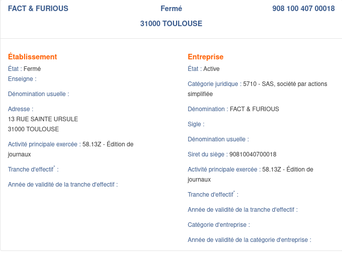 Résultat SIRENE quand on recherche Fact&Furious // source : sirene.fr