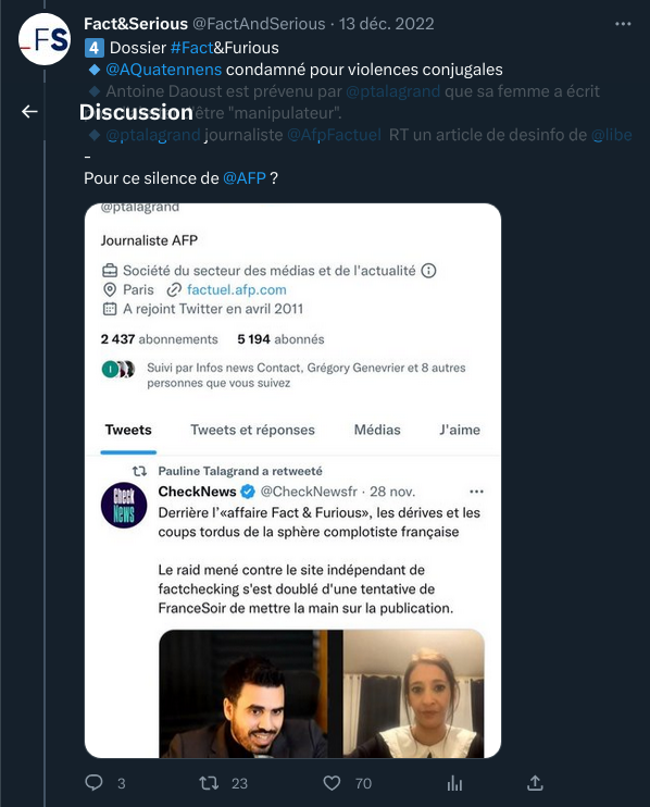mentirait sans indiquer de preuves, la journaliste de l'AFP questionnée par ma part ne m’a toujours pas répondu, je vais me contenter de la portion de l’article de Libération, or le média, a eu des confirmations comme quoi Antoine et Malika Daoust auraient tombés alors que ce dernier tentait de récupérer son portable, la gendarmerie qui a reçue la plainte de M. Daoust a confirmé au journaliste de CheckNews. Mais ce n’est pas fini Fact&Serious indiquerait dans 2 tweets que Fact&Furious serait en lien avec Pfizer, alors que le média a (je suppose) fait une interview au sein du siège de Pfizer. Ces deux tweets tout comme d’autres prouvent que l’officine de Xavier Azalbert ne respecte pas le premier point de la Charte de Munich.