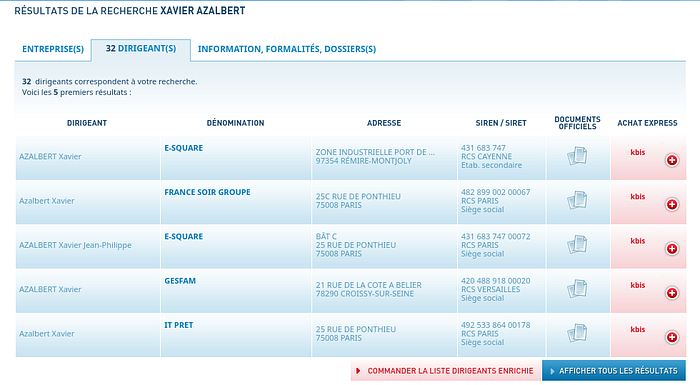 Maintenant faisons une recherche sur Xavier Azalbert, et nous voyons effectivement qu’il est dirigeant du Groupe France Soir, mais également d’autres entreprises. Mais hélas pas d’infos sur Fact&Serious. Alors qu’en France il est obligé d’informer la chambre des commerces afin d’avoir un SIRET et donc d’être enregistré sur Infogreffe et sur la base SIRENE.