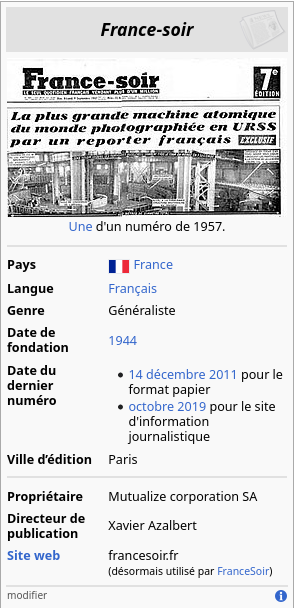 Regardons sur Wikipédia et nous voyons que FranceSoir est la propriété de Mutualize Corporation SA.