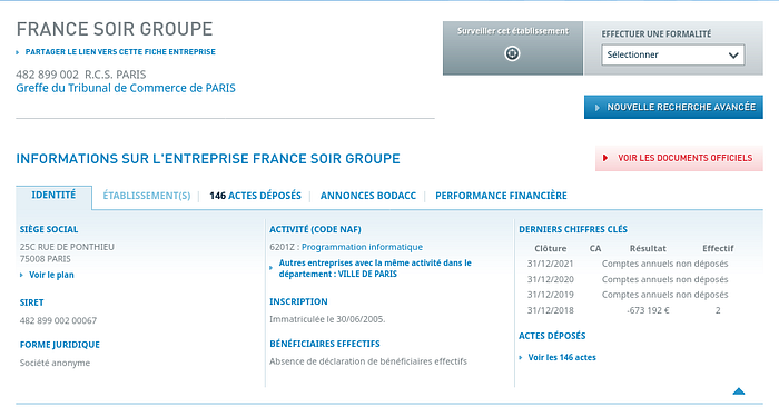 En faisant des recherches sur Infogreffe on peut tomber sur des infos croustillantes, comme le fait que le groupe France Soir n’a pas indiqué son Chiffre d’Affaires. Ce qui est un comble, en sachant qu’Infogreffe permet au public et aux pros de vérifier un établissement.